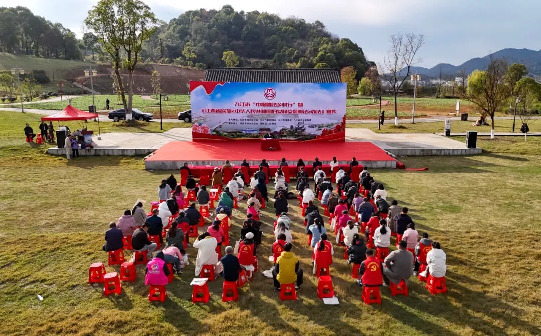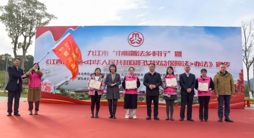 11月26日,九江市妇联、九江市委网信办、九江市司法局、九江市农业农村局联合在瑞昌市夏畈镇举行九江市“巾帼普法乡村行”暨《江西省实施<中华人民共和国妇女权益保障法>办法》宣传活动。九江市妇联党组书记、主席桂白丽出席活动并讲话,九江市妇联党组成员、副主席曹秀林主持活动,九江市委网信办副主任徐世海,九江市司法局二级调研员黄振贵,九江市农业农村局总畜牧兽医师闵汉荣出席活动,瑞昌市委副书记冯美鑫出席活动并致辞。九江市、瑞昌市相关单位科室负责人、基层妇女干部、司法所干部、基层“法律明白人”代表、村妇女小组长、妇女群众等共计100余人参加活动。